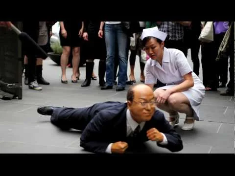 In the film “Inside Track”, performance artist Momoyo Torimitsu considered competition as an essential part of the New York experience. Her robotic businessmen transposed psychological competition to a physical contest among American, European and Asian businessmen. The three robots are astonishingly life-like, capturing the demeanor of businessmen determined to win.
